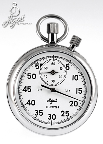 60-second stop-watch dial, with 0,2-second division value. 60-min counter, with 1-min division value. Chrome-plated metal case.